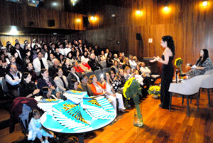 Acto seguido, Leslie le pidió a Priscila (su hermana) subir para acompañarla en una segunda silla ya dispuesta para ella, quien de igual forma arrancó aplausos al pararse de las primeras butacas del auditorio, estando acompañada por sus padres Mónica y Ricardo.