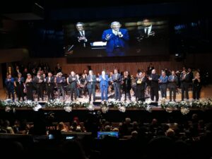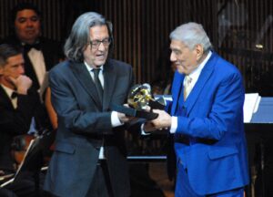 Para esta entrega subieron al escenario miembros del consejo directivo y algunos invitados especiales. Memo Méndez Guiú y el Mtro. Martín Urieta quien comentó… <<Es para mí un honor entregar este reconocimiento a un hombre que ha dedicado su vida a la música, a su familia y a engrandecer el acervo musical de México>>.